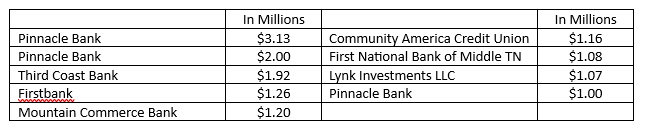 Along with the warranty deeds, 381 loans worth $128.96 million also made it into the records last week. Eleven of those were a million dollars or more. The highest value mortgage at $14.5 million was funded by Southeast Bank. Pinnacle Bank loaned the most money with four loans on the list; the largest was $11.05 million. The others are as follows: