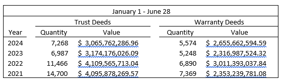 In the last week of June 2024, 1,529 documents were added to the books. Warranty Deeds accounted for 281 of those recordings and had a total value of $194.61 million. These transfers included 11 sales valued at $1 million or more.