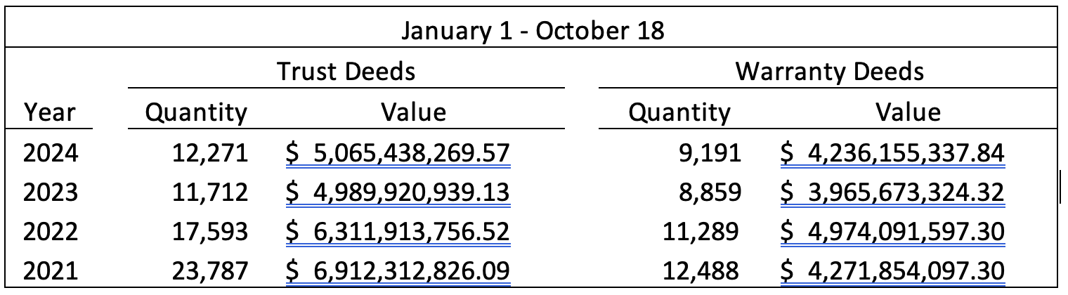 During the week of October 14-18, 2024, 1,209 new documents were recorded. The total included 254 Trust Deeds, 150 Warranty Deeds and 385 Release documents. When a loan or lien is paid off, the lender or creditor files a release, which satisfies the original debt. Releases are our most recorded document. In fact, so far this year, we have recorded more than 14,000!
