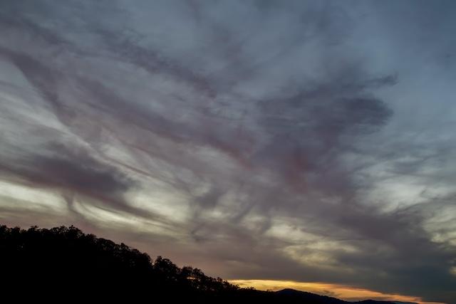 A man and his family were enjoying the view from Mills River Valley Overlook on the Blue Ridge Parkway this past Friday evening. Evidently seeing the two cameras strapped around my neck, he correctly deduced that I was a photographer. He approached and, in broken English, asked whether there was a chance that the then gray, wispy clouds on the horizon could produce a colorful sunset “para mi familia.”