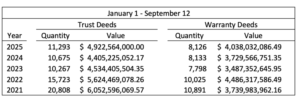 During the week of September 8-12, 2025, a total of 1,341 documents were added to the Knox County property records. Among those were 289 trust deeds with a total value of $164.03 million. The largest amount borrowed was $55.99 million, funded by Keybank. Citizens Bank backed a loan for $14.55 million. Mountain Commerce Bank, which had two loans exceeding $1 million, loaned the third highest of $7.5 million. The other high value loans are: