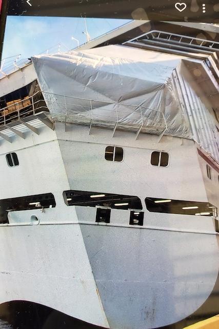 - Partially repaired stern of the Carnival Glory a week after the crash.