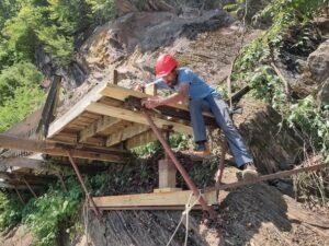 These staff members have other jobs at Ijams, but the boardwalk repairs were done “swiftly and with great care,” according to a post on April 23. “It took people on land, in the water and sometimes dangling in the air to fix a structure that is anything but easy.