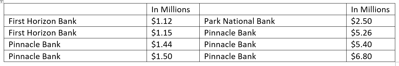 Lending generated 261 trust deeds valued at $103.79 million. This includes 10 loans over $1 million. Wesco Bank Inc. funded the highest-value loan of $12 million. American United Life Insurance Co. backed one for $9 million. Five of the loans were made by Pinnacle Bank and First Horizon Bank had two as follows: