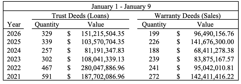 During the week of January 5-9, 2026, a total of 1,088 documents were recorded. Loans recorded on trust deeds accounted for 274 instruments valued at $127.66 million. Regions Bank backed the largest loan of $20.89 million. The second-highest amount borrowed was $17.75 million, funded by Community Trust Bank. The other three loans over $1 million are below: