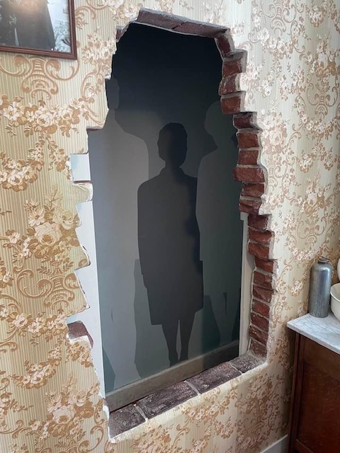 - Wall torn to show how narrow space was: six adults and belongings had to fit