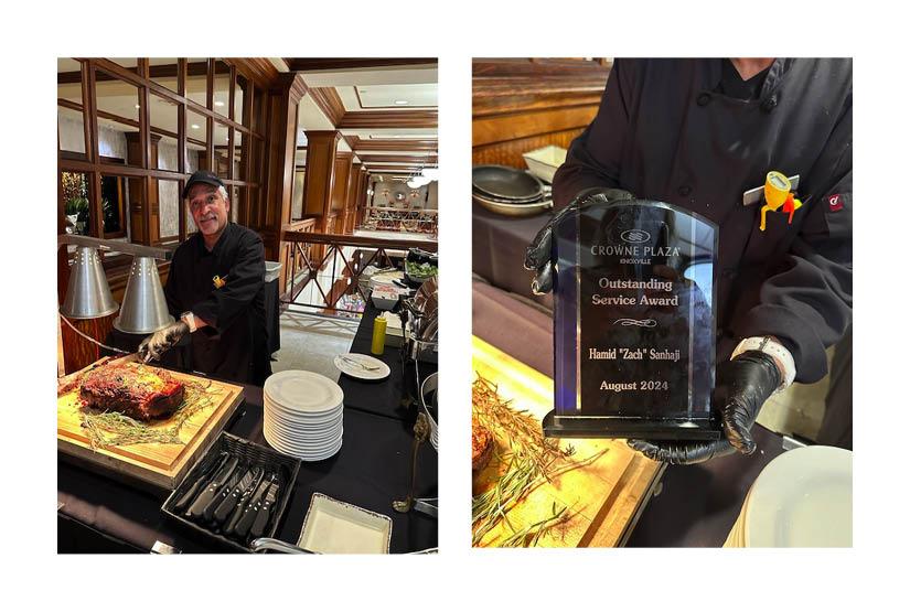 The prime rib/ pasta station is serviced by Zach Sanhaji, who was the ultimate in accommodating and his food was incredible. He prepared the pasta dishes per order at his station. When I asked for his picture for this article and complimented his service, I was not surprised to learn he had just been awarded the Outstanding Service Award for August 2024!