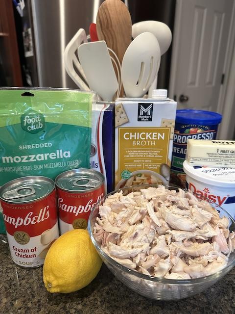 - Mix soups, chicken broth, lemon juice, mayonnaise, and sour cream. Add in noodles and chicken. Mix well.