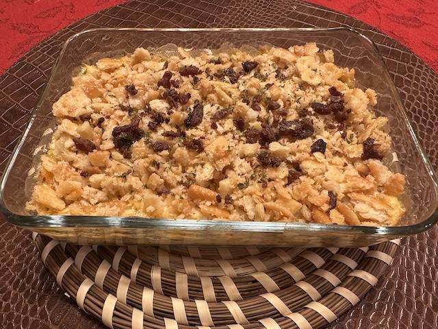 - 10 slices bacon, cooked and crumbled (divided: 6 for casserole and 4 for topping)