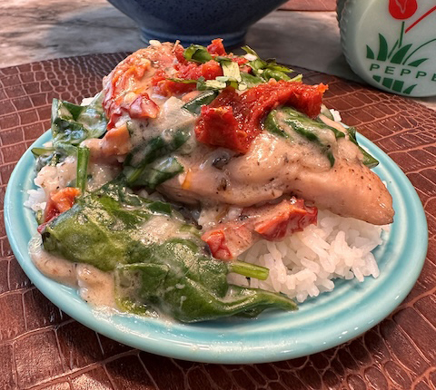Creamy Tuscan Chicken is an Italian-American dish, not a traditional recipe from Tuscany, Italy, popularized by restaurant chains like Olive Garden. The dish draws inspiration from “Florentine” style cooking (which uses spinach and cream) and combines it with garlic and sun-dried tomatoes to create a “Tuscan” aesthetic. My version is dairy-free, using coconut milk instead of cream.