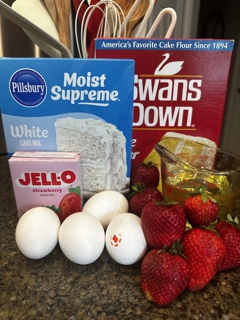 - Mix together cake mix, flour, gelatin, eggs, water, oil and strawberries.