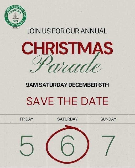 The second event is the Fountain City Christmas Parade, scheduled for Saturday, December 6, 2025. Save the date. If you are interested in participating by sponsorship or providing a float, see the application www.fountaincitychristmasparade.com to fill out the sponsorship form and/or the participant application to have a float in the 2025 Christmas Parade. The deadline for participant applications is October 28, 2025. If you have questions, reach out to Charlie Pratt at Charles.pratt@mwarep.org