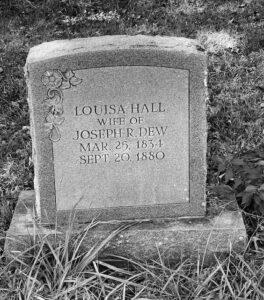 Louisa has a fairly new marker on her grave. Born in 1834, she was just 46 when she died. She was a granddaughter of Thomas Hall, founding father of the crossroads. She married J. R. in 1860. The next year, they had their first child, a son, William Donald, who lived until 1932. After D.W. (as he was known), Louisa and J.R. endured one heartbreak after another. It was not an uncommon story of the 19th century: many children born, but not all make it out to adulthood. That story is written in the four graves adjacent to Louisa: Anna Jane (1864-1865) Fannie Lee (1868-1872), Lula Helen (1871-1872), Joseph Franklin (1875-1876).