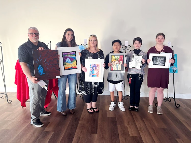 - HHS students: Teacher Lewis holding Jennifer Andrews art, McKenna Reed, Teacher Lynch holding Rubi Justiniao-Vega art, Thomas Francisco, Georgia McMahan, Lily Foust