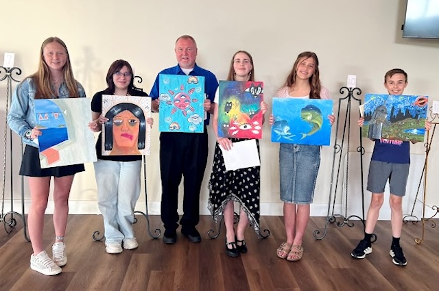- HMS students: Ella Drinnen, Teacher Brown holding Jaelyn Jennings art, Ariella Ellis, Coraline Smith, Charlotte (Charlie) Collins, Jackson Carter