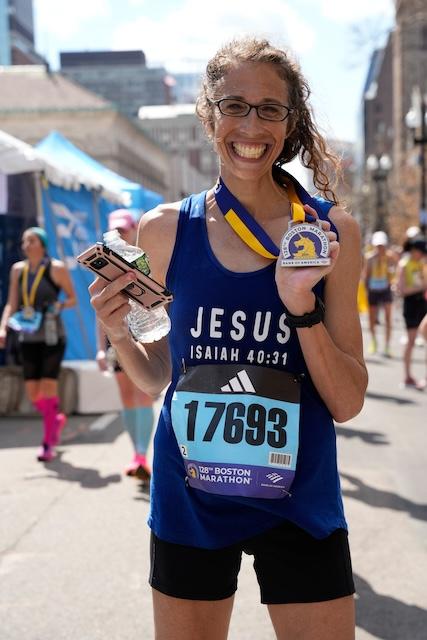 Jennie finished the Boston Marathon in a faster time than she imagined. The drama wasn’t quite over. Just after finishing, she walked to get her gear bag and collapsed with a Charlie horse in her left calf. In excruciating pain, two gentlemen helped her into a wheelchair and massaged her calf until she could walk again.