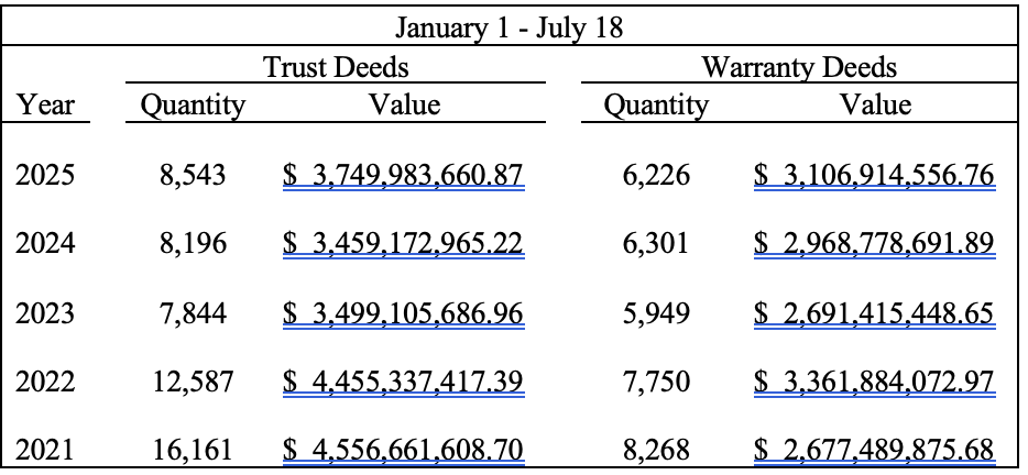 During the week ending July 18, 2025, a total of 1,329 documents were recorded. This included 322 trust deeds, or loans, with a combined value of $104.92 million. Nine were loans valued at over $1 million, with the largest funded by First Horizon Bank for $2.82 million. The other high value loans are below: