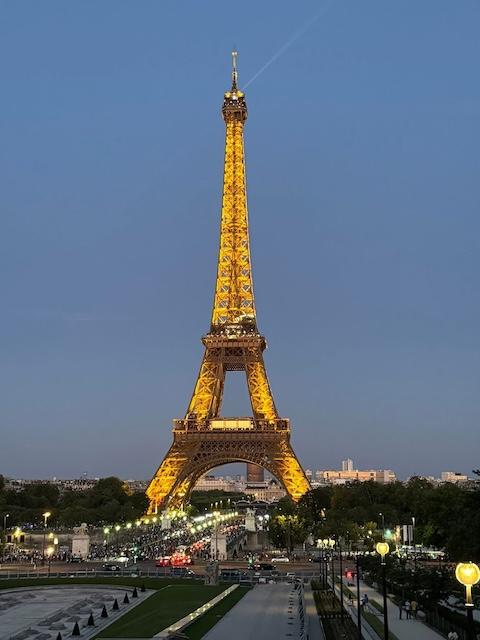 The Eiffel Tower designed by Gustave Eiffel, made of wrought iron, was completed in 1889, and stands as a 984-foot iconic symbol of Paris.