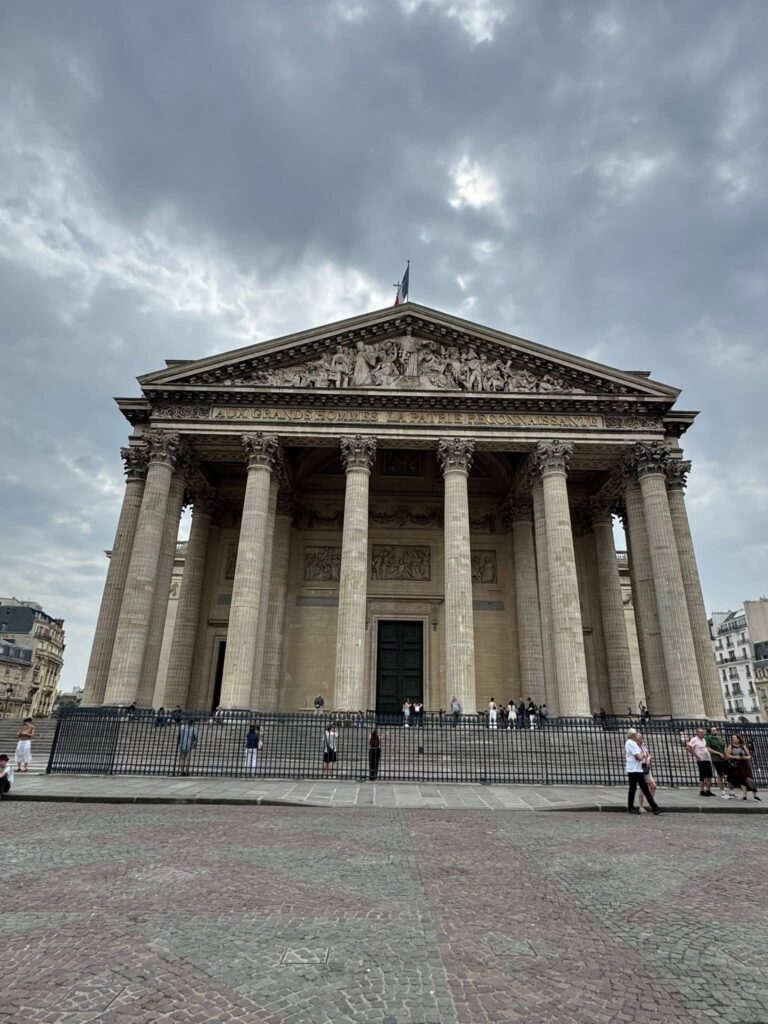 The Panthéon is a neoclassical landmark originally built as a church dedicated to St. Genevieve, now serving as a mausoleum for famous French personalities like Voltaire and Marie Curie.