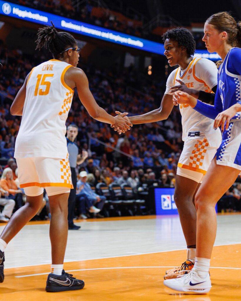 Alyssa Latham, right, congratulates freshman Jaida Civil. (Kate Luffman/Tennessee Athletics)