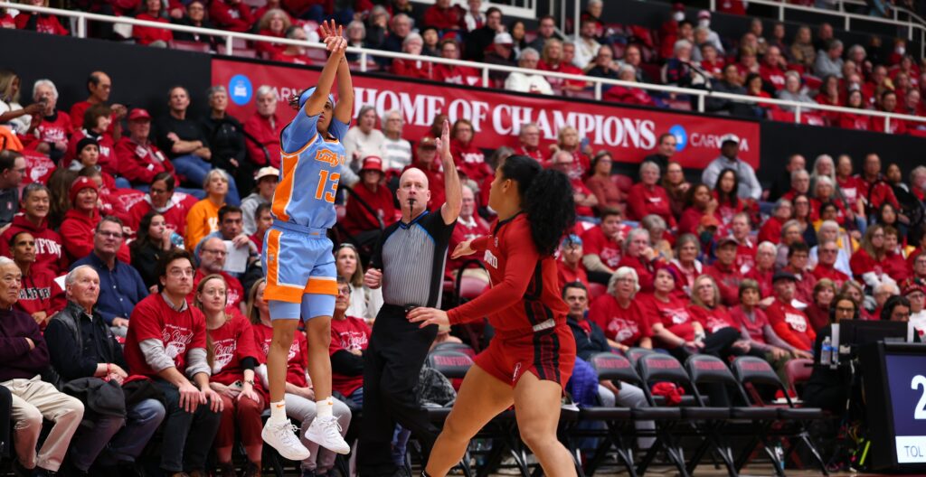 Mia Pauldo launches a three against Stanford. (Kate Luffman/Tennessee Athletics)