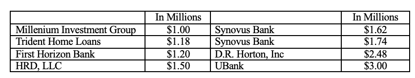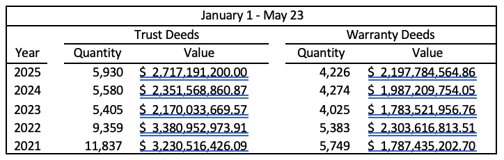The week of May 16-23, 2025, concluded with 1,532 documents added to the county property records. Of those, 344 were trust deeds (loans) with a combined value of $230.49 million. There were 11 loans funded for over $1 million, with the largest at $7.04 million, financed by First Community Bank of East Tennessee. A private party funded the second highest for $6.5 million. The third largest came in at $5.38 million and was backed by Old National Bank. The other loans for $1 million or more are outlined below: