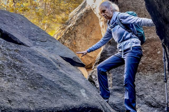 Oh, joy, thought Badger. Having a history of 22 orthopedic surgeries, an artificial hip and a fused right ankle, the bouldering seemed more like lumbering through the maze. Out and back. Twice was not easy by any means, but the course seemed less daunting for the nimble ballet-trained Rock Sprite. She moved with the grace of someone who’s danced across countless rocky ledges, but even she admitted the physicality: “It’s like the trail is alive, daring you to find the path.”