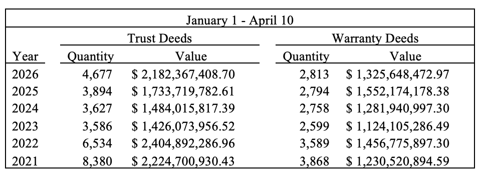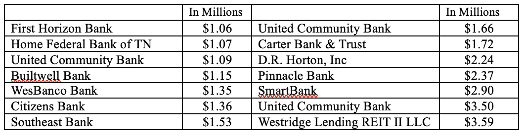 During the week of April 6-10, 2026, a total of 1,689 documents were recorded in the Register’s office. Among those were 480 trust deeds, or loans, valued at $168.85 million. The largest loan of the week was $8 million, funded by Home Federal Bank of Tennessee. The next highest was $7.35 million, loaned by Citizens Bank. The other high-value loans are outlined below:
