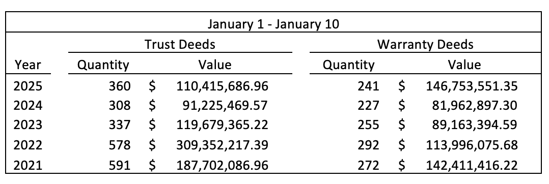 Hopefully everyone was able to enjoy the snow over the weekend, whatever that may look like. We definitely took advantage of the weather with the youngsters around my house with lots of sledding and snowmen. Even with the uncanny weather for these parts, things picked up a little with the first full week of the new year. A total of 1,187 new documents were put on the records in the Register’s Office for Knox County. This is a bit over 200 additional recordings than the week that brought us into 2025.