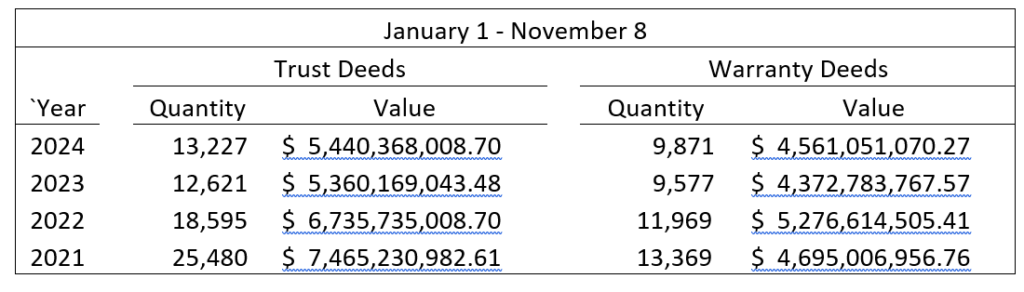 Warranty Deeds (sales) with a cumulative value of $129.93 million accounted for 212 of the total deeds recorded. Thirteen properties came in with prices over $1 million, including four commercial transfers.