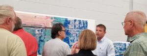 Jim Snowden (back, right) talks with residents at one of three maps at Powell Middle School.