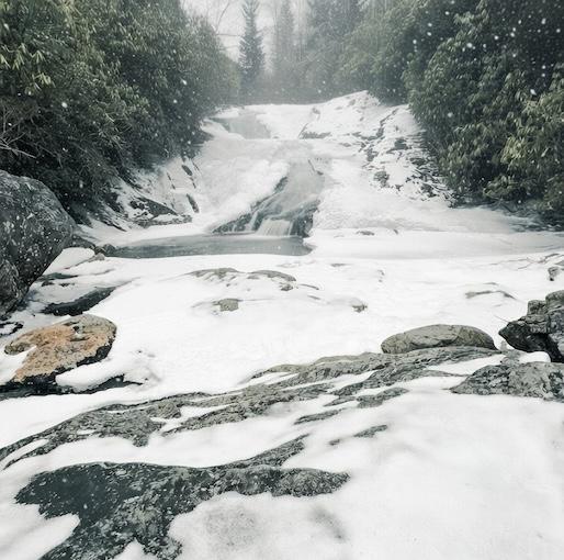 My aim was to document the beginning of the storm on NC Hwy 215, known to aficionados as Waterfall Highway 215. With snow falling on the highway above the 4800′ feet elevation mark, my target soon became Bubbling Spring Branch Falls, located less than 50 miles from the Tennessee line. Aligning my outing with the storm’s arrival on January 24 and brandishing my microspikes and camera equipment, I negotiated the short but slippery path to the falls, enduring wind gusts and the onset of ice and snow.