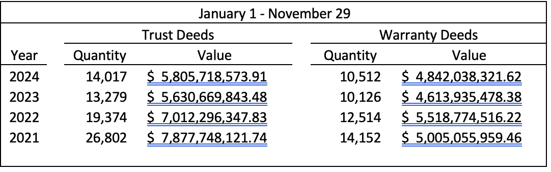 With the short workweek also being the end of the month, we were very busy last week! A total of 863 new documents were added to the records. For the lending side of things, 224 trust deeds (loans) came through equaling $67.99 million.