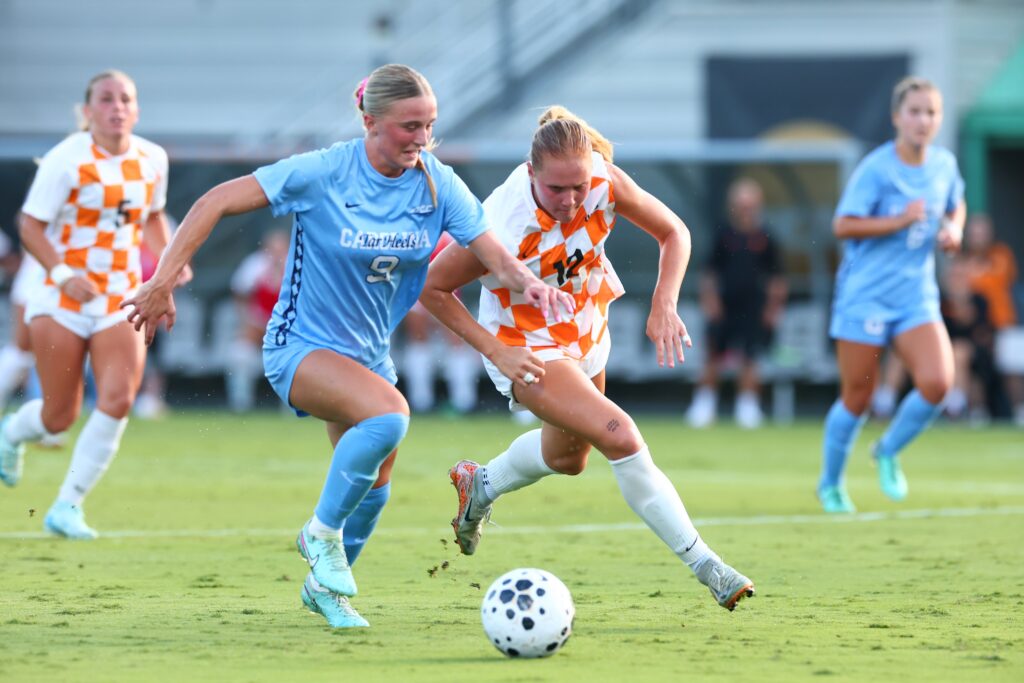 Tennessee’s Reese Mattern battles Tar Heel defender Hope Munson. (Tennessee Athletics)