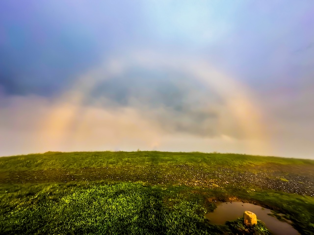 We witnessed first a fogbow which is rarer than the April snowbow I saw. Then as I approached Timm, who stood on the AT, yet another event caught my eye: a phenomenon known as a rare Brocken spectre. The spectre is caused by a huge shadow of a figure (in this case, my shadow) illuminated against the cloud bank opposite the setting sun. A photographer trifecta occurred when the “glory” (a circular rainbow, ALSO a rare event) wholly enveloped the spectre, which was enveloped by the fogbow.