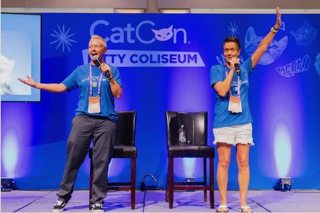 The Two Crazy Cat Ladies, well known in the feline health industry, answer questions at CatCon, held in Pasadena, California last month