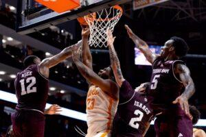 Both teams missed many shots. The Vols finished at 37.3 percent, the Aggies 36.4. Tennessee endured 19 turnovers. The Aggies had 20. They made 13 threes. Rebounding domination (59-33) saved the game for the Vols. Eight of 10 free throws made a wonderful difference in the extra periods.