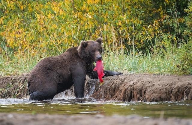 Expert hunters, these bears can catch 30 salmon or up to 120 pounds per day. An average male bear will weigh between 700-900 pounds by mid-summer. By late summer, their weight will be about 1,200 pounds.