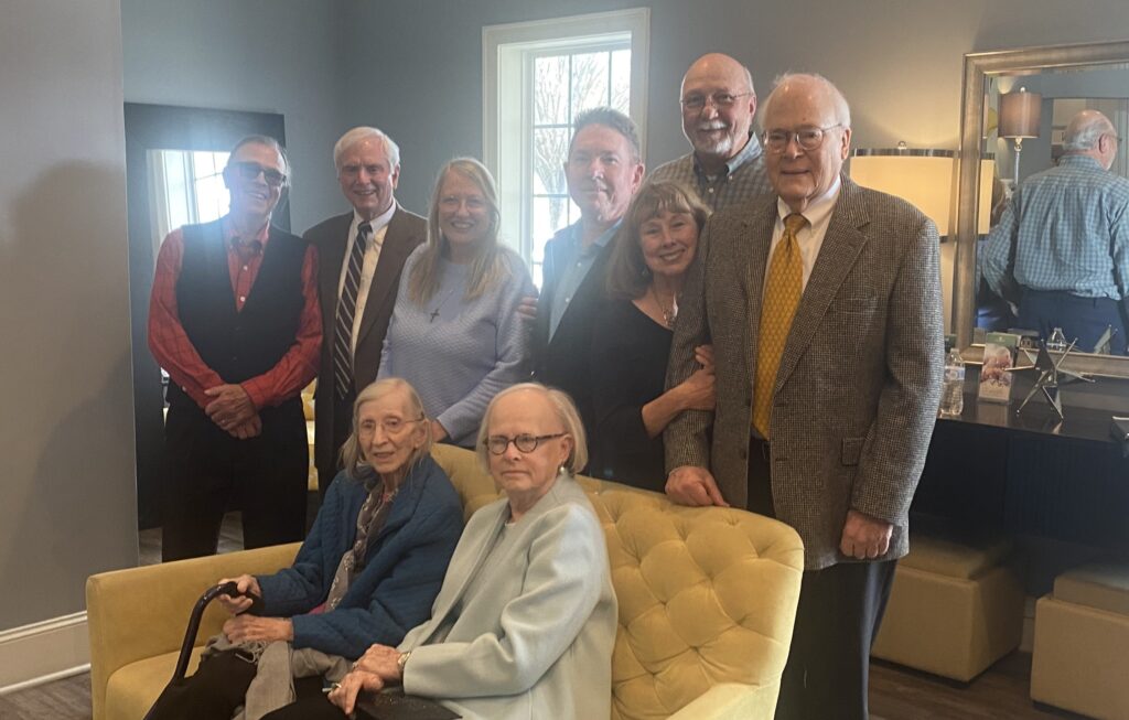 Cousins and spouses: Dan Arp (spouse) Rex Pepple. Sharon Wood, Alan Locke, Cindy Card Arp, James Card, Hugh Neil (spouse) seated Patsy Card Irwin, Sara Jo Card Neil
